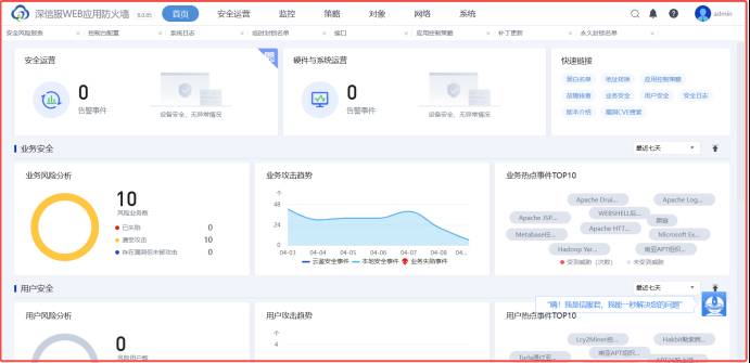 深信服WEB应用防火墙的监控界面,主要内容包括设备状态、安全运营和网络运营三个方面。以下是详细的分析和总结: