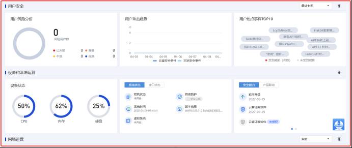 整体来看,WAF 应用防火墙的设备状态稳定,主要包括CPU、内存、硬盘的使用情况,以及系统的安全状态和网络运营情况。所有关键指标均显示正常,没有告警事件发生,表明设备运行稳定且安全