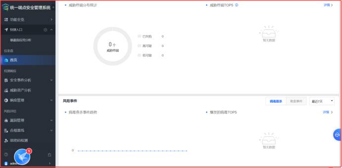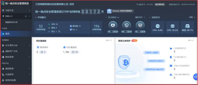 从图表看,当前EDR终端管理平台共管理授权主机51台服务器。近1个月无风险事件,0个勒索事件,0个终端服务器威胁。