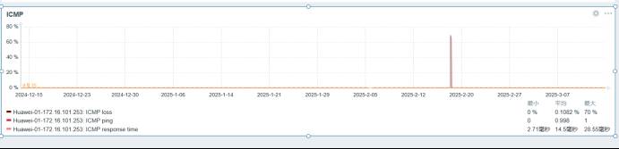 从图表看监控主机到达出口防火墙内网接口ping的延迟时间平均为1ms,响应时间平均为15ms,丢包率为0%。从整体看近3个月数据分析内网处理正常状态,有偶发网络波动可忽略。
