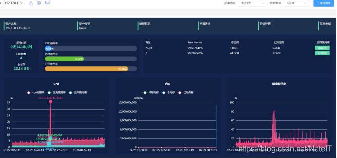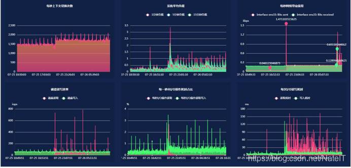 其中CPU、内存、磁盘使用率、每秒上下文切换次数、系统平均负载、每秒网络宽带使用、磁盘读取速率、每一秒I/O读写耗时的折线数据图,让数据更加一目了然,更加具体‘’