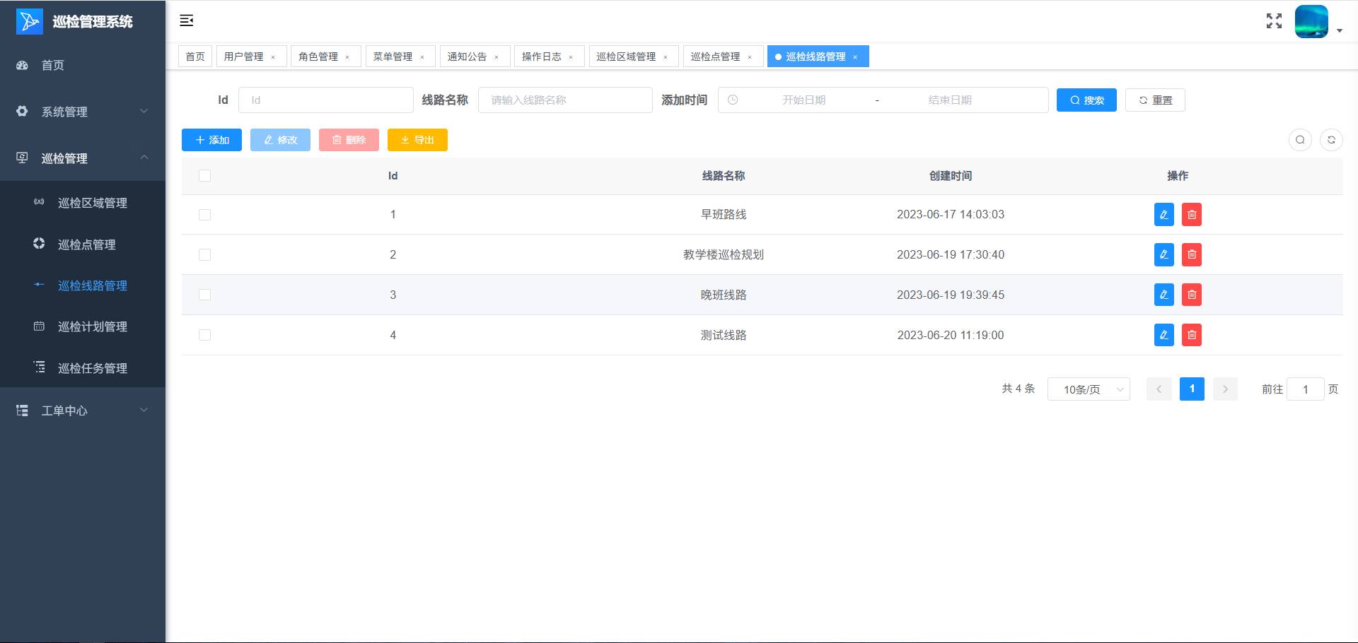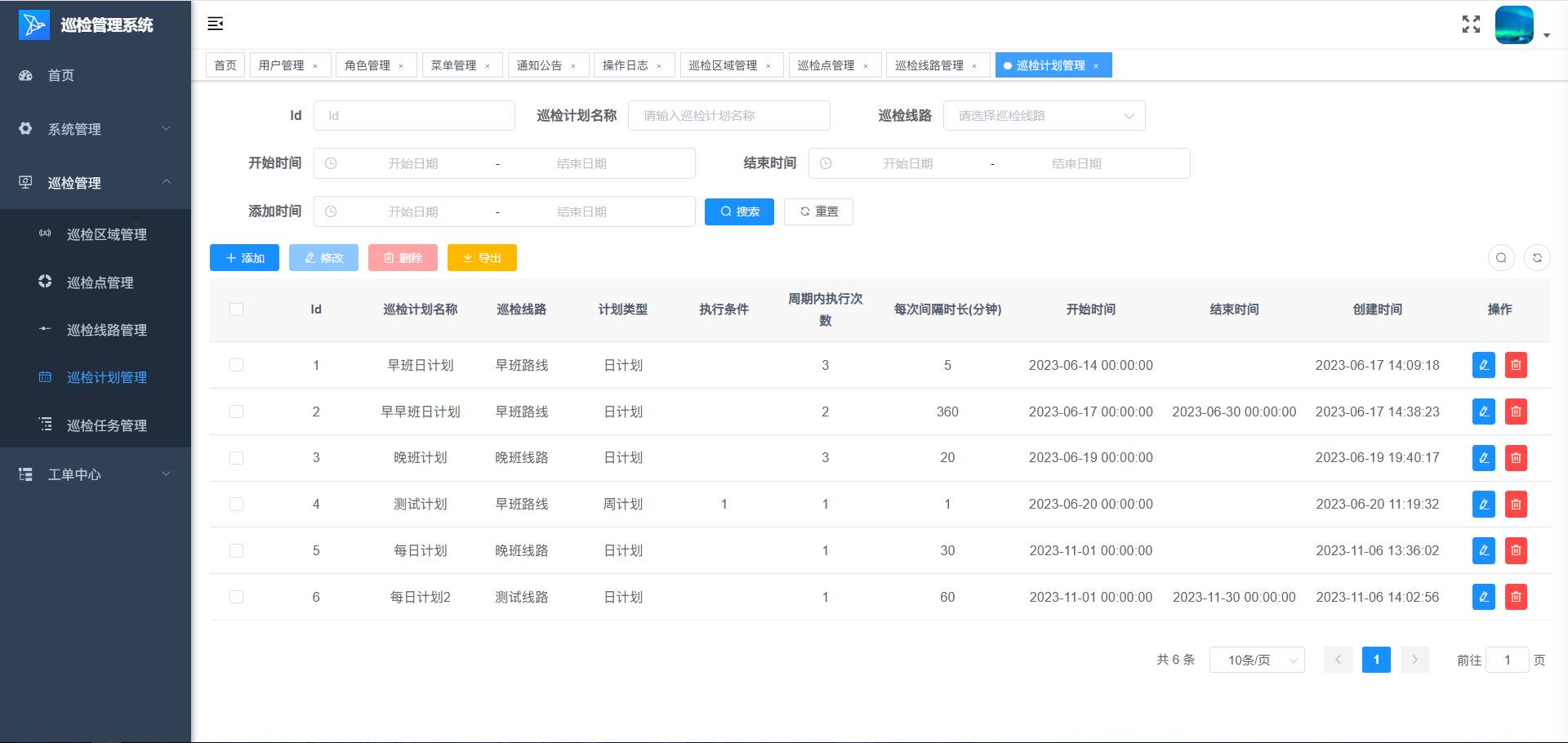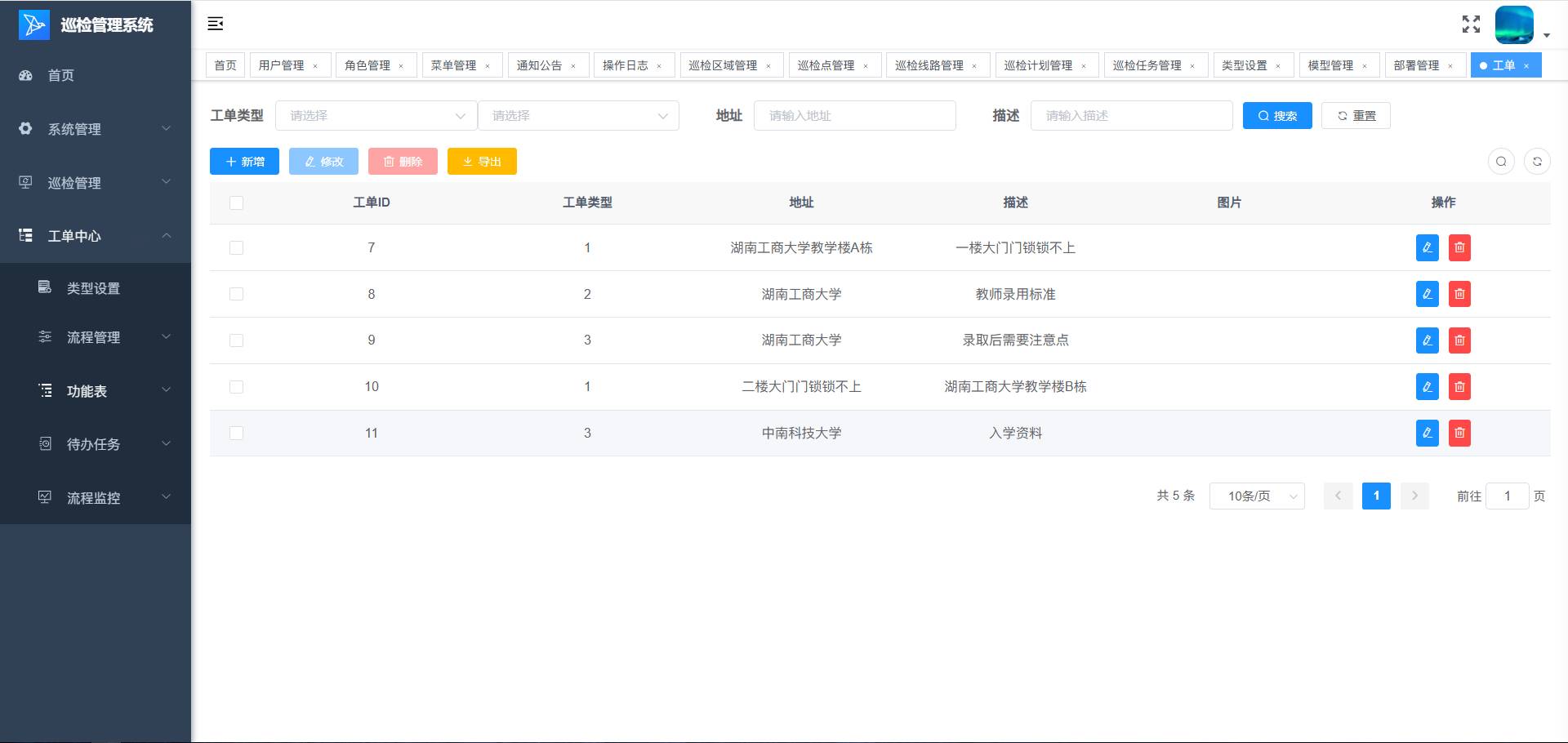 巡检管理:包括巡检区域管理、巡检点管理、巡检线路管理、巡检计划管理、巡检任务管理等功能,可以对巡检工作进行全面的计划和管理。