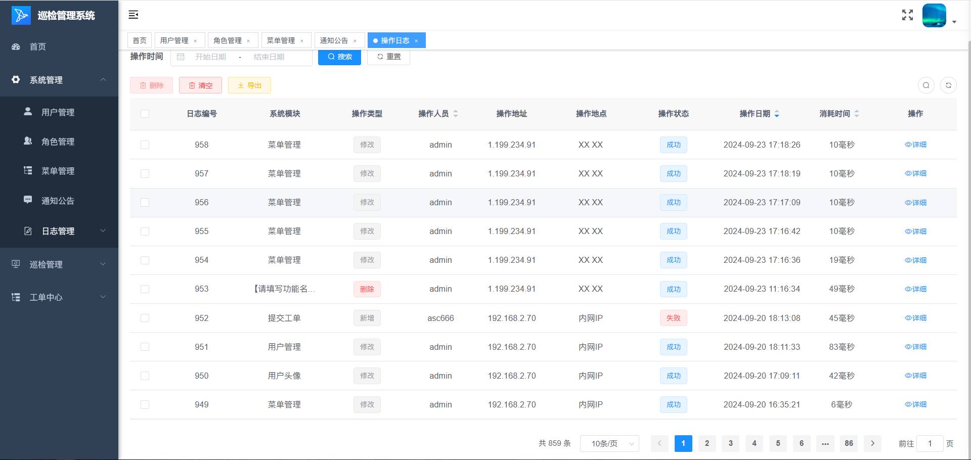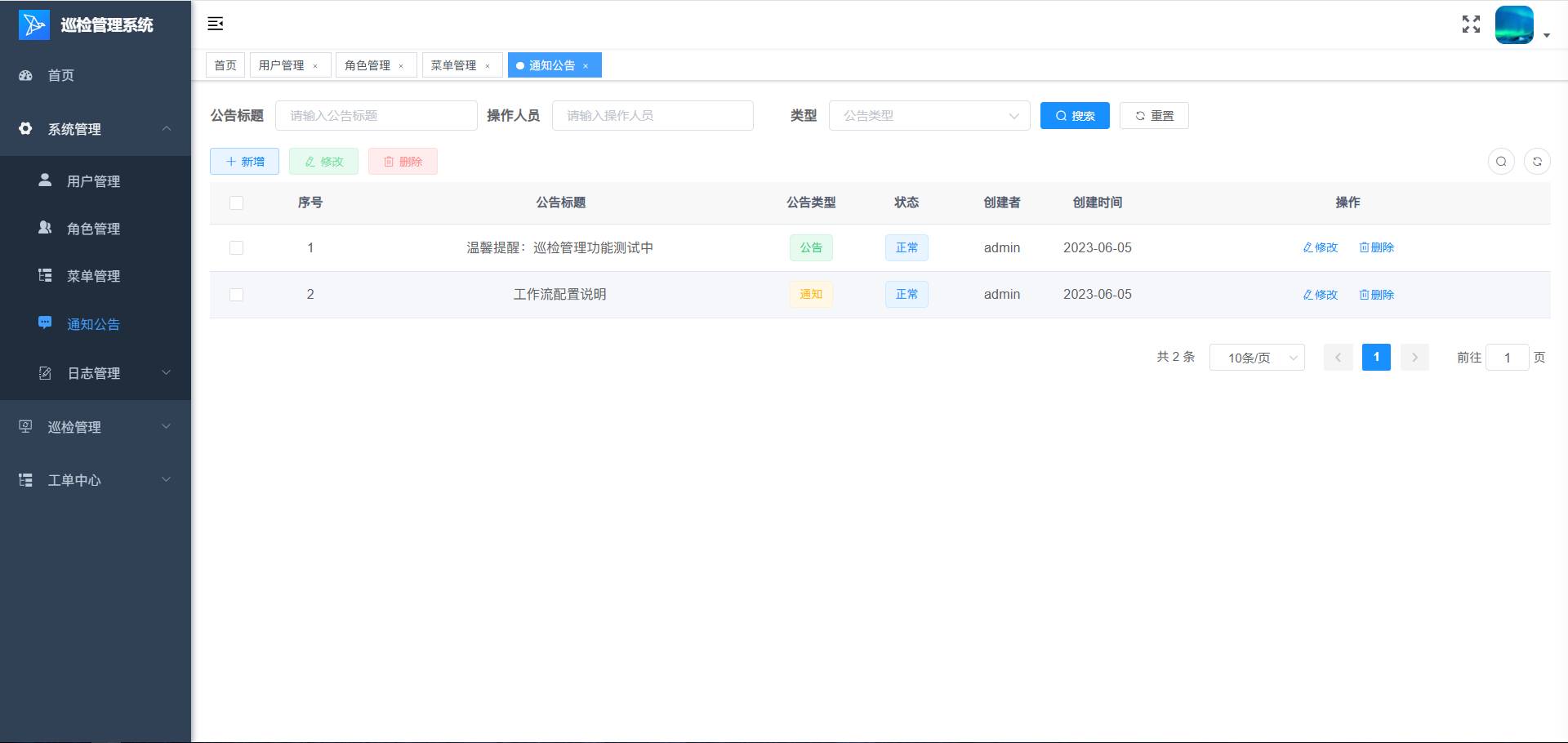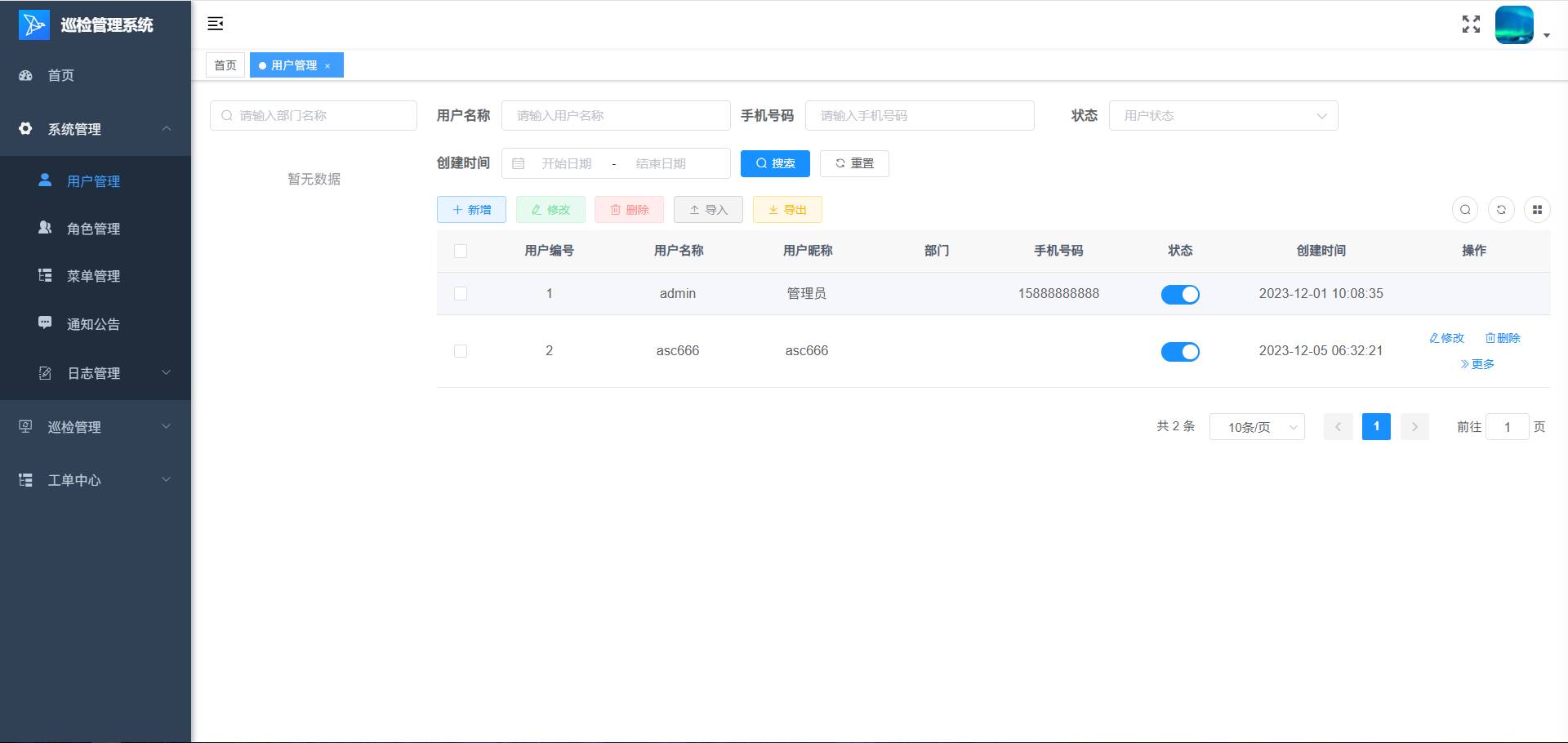 系统管理:包括用户管理、角色管理、菜单管理、通知公告、日志管理等功能,可以对系统进行基础的配置和管理。