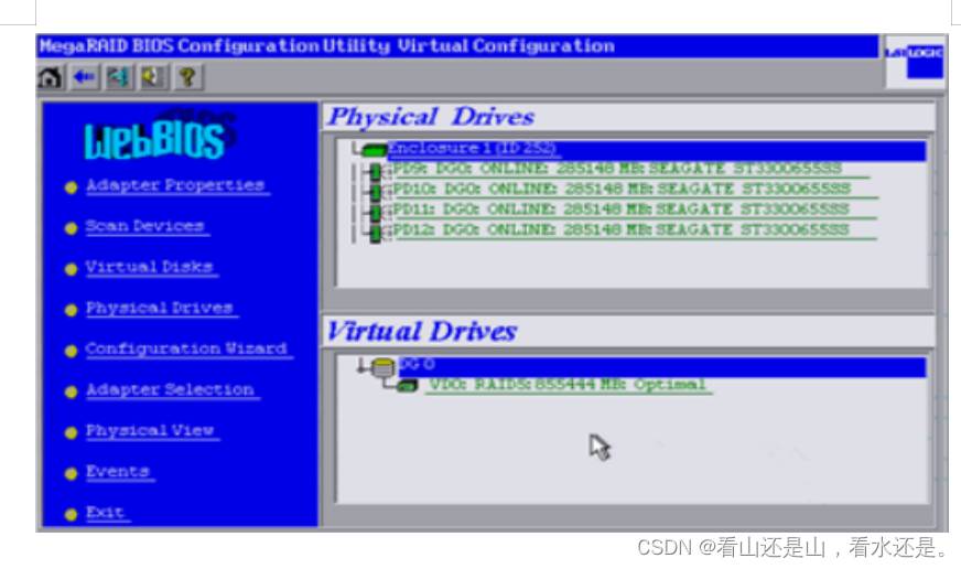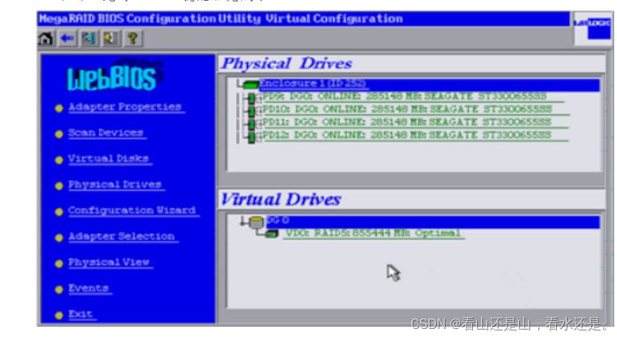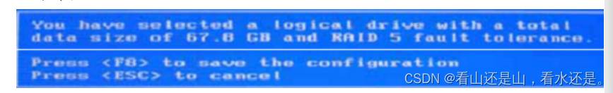 提示内容:你已建立了一个67.8G和阵列等级为5的逻辑磁盘。请按F8来保存配置,按ESC取消。按F8保存配置后,这个RAID5就创建好了。