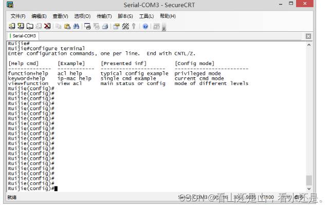 (8)在以上两种模式中就可以进行配置,配置完成后一定要记得(锐捷交换机wr)保存配置。(H3C交换机save)