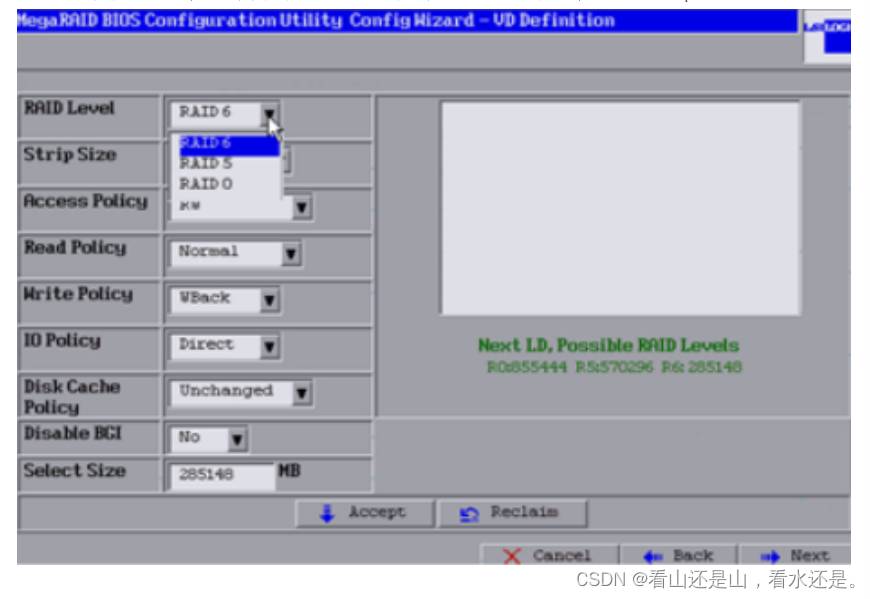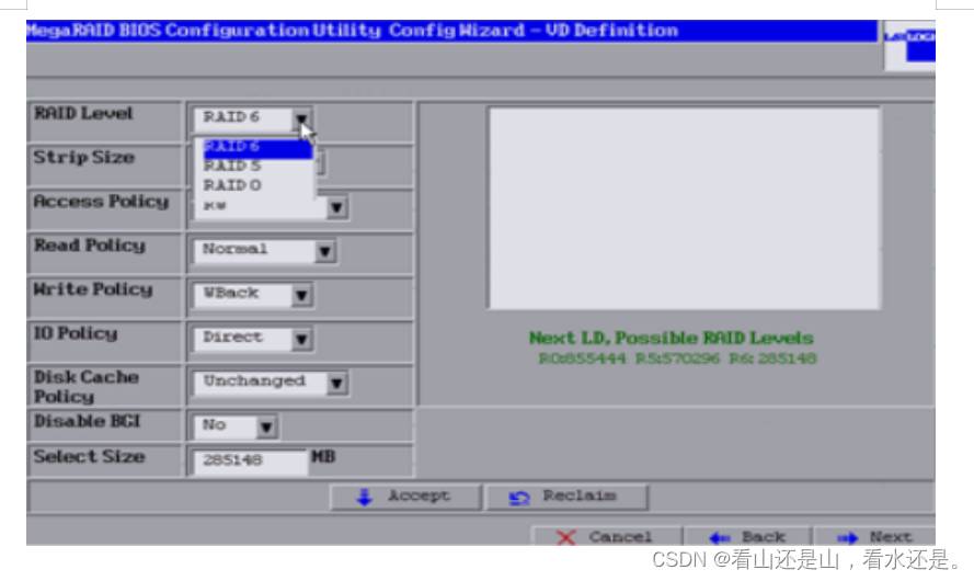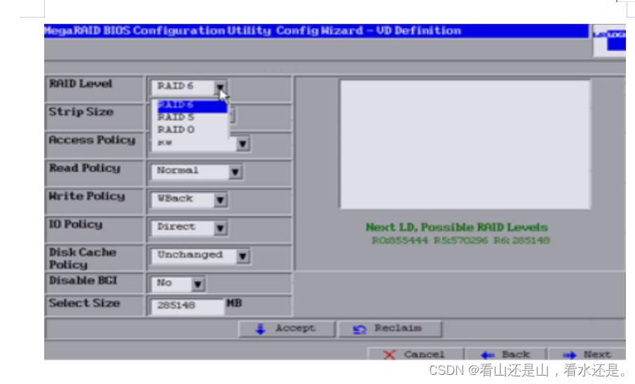 在RAID Level选项按回车,可以出现能够支持的RAID级别,RAID卡能够支持的级别有RAID0/1/5/10/50,根据具体配置的硬盘数量不同,这个位置可能出现的选项也会有所区别。