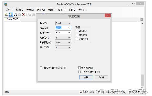 (4)新建快速连接任务,选择协议为Serial、端口为本机识别到的端口号、波特率为9600,在这里只针对交换机,某些安全设备的波特率不等,按情况而定。