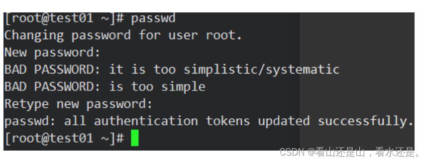 (6)修改root密码:在单用户模式下输入:passwd 回车输入新密码(2次),提示成功,修改完毕。