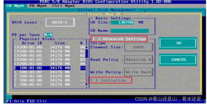 修改高级设置,可以按向下方向键,或者Tab键,将光标移至Advanced Settings处,按空格键开启(禁用)高级设置。如果开启后(红框处有X标志为开启),可以修改Stripe Element Size大小,以及阵列的Read Policy与Write Policy,Initialize处可以选择是否在阵列配置的同时进行初始化。