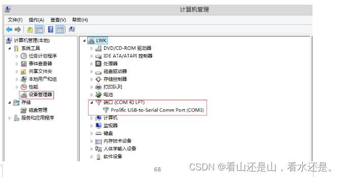 (3)确认识别到的端口号:右键单击我的电脑—管理—设备管理器—端口,查看端口状态,确认您连接使用的是哪个端口(COM)。