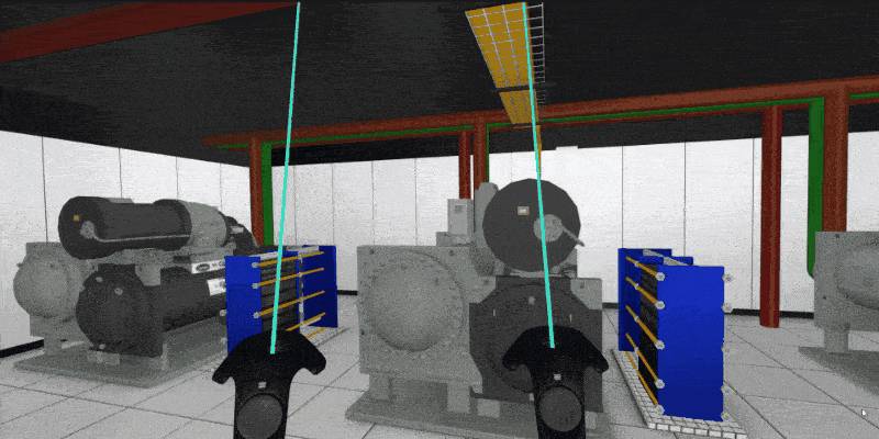 通过图形引擎强大的渲染功能,将工业设备的各个部件孪生搭建。进入虚拟空间后,以遥控 VR 手柄发出的射线代替双手,将模型抓取至需求位置,详细查看其前、后、左、右、上、下等任意角度。有效避免了因现实机械设备过重、过贵、过大,而造成得展示不全面。针对设备布局可增添拆解演示模块,利用 VR 手柄对设备零件进行拆解、组装、旋转等操作,展现内部布局细节,配合面板释义,阐述设备作用和功能。