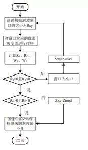 式中,Zxy描述的是坐标灰度值。 当R1>0、R2<0时,就需要转换到LevelW,反之则需要扩大滤波窗Sxy的尺寸。若Sxy的尺寸达到Smax,就说明Smax是Sxy的输出值。当R1>0、R2<0时,就要将Zxy用作输出值,反之输出值为Zmed。 那么中值滤波算法对变电设备红外热成像的滤波流程如下图所示: