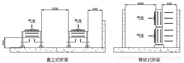 风冷冷凝器的四周应留有足够的通风及维修空间,设计无规定时,设备与围挡物之间及二台设备之间距离应大于1.5m;留有人员上下维修的通道。