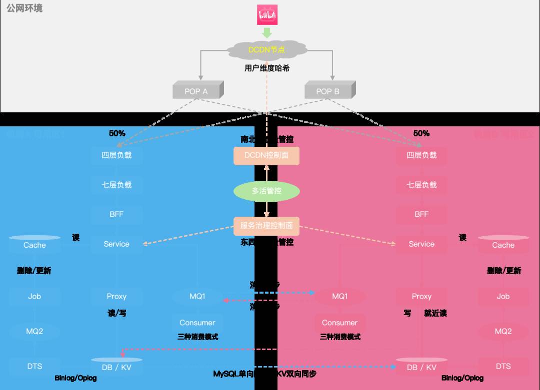 B 站接口类请求主要通过 DCDN 加速回到源站,DCDN 节点分为两种类型,通过公网回源的公网节点和通过专线回源的专线节点。正常情况下 DCDN 公网节点可通过双公网 POP 回到源站,DCDN 专线节点则通过内网专线回到源站。并且在 DCDN 层面,有针对源站的 Health Check 功能,会自动摘除探测异常的源站 IP。比如当 DCDN 节点请求回源 POP A 发生异常时,会重试到 POP B。DCDN 公网节点常态可通过双 POP 交叉回源站,应对 DCDN 到某一个源站 POP 点出现丢包或中断,容灾方案自动生效,对业务几乎无影响。