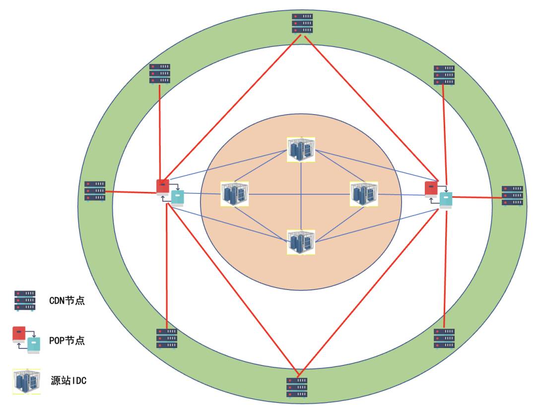 同时从图2可知,为了提升自建 CDN 节点到源站核心机房的回源稳定性和效率。我们完成了 B2-CDN 环网的设计和建设,实现了从边缘 L1 & L2 自建 CDN 节点通过该环网进行回源,丰富了业务从边缘节点回核心源站获取数据的途径。其实 B2-CDN 环网的设计初衷是为了给各 L1 & L2 自建CDN节点在处理边缘冷流、温流、热流时能有更多的手段,以探索更加适合有 B 站业务特征的边缘网络调度方式。B2-CDN 环网底层通过二层 MPLS-VPN 技术实现各节点 Full-Mesh,并在此基础上通过三层路由协议(OSPF、BGP) 实现各节点与源站核心机房之间的互联互通。同时各业务保留通过公网回源核心机房的能力,做为 B2-CDN 环网出现极端故障情况下的兜底回源方案。