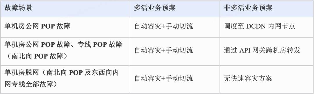 针对本次故障中遇到问题,我们重新评估了单机房故障的预案及改进措施,可以看到多活业务整体的止损预案是一致的,重点关注自动容灾生效及手动切流的效率;而非多活的业务需要有多种逃生手段:通过DCDN内网节点回源、或通过API网关跨机房转发。