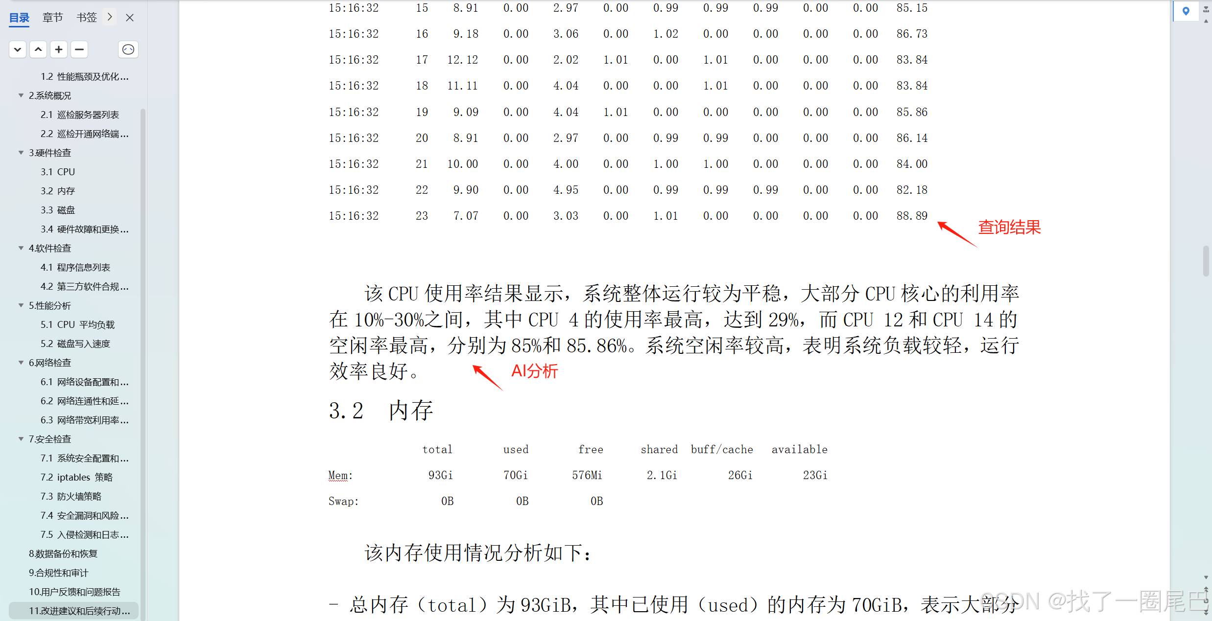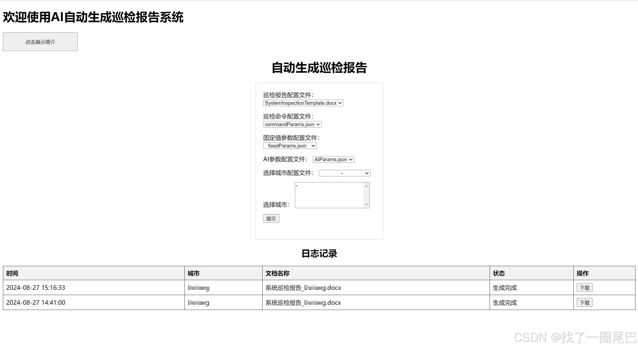 该系统的优点在于其高度的灵活性。通过定义配置文件的内容,系统能够自动生成不同内容的系统巡检报告,无需手动操作。此外,系统利用智谱AI大模型对系统巡检结果进行深入分析和整合,从而生成内容详尽的巡检报告。尽管AI处理结果存在一定的不确定性,但系统生成的文档是基于docx模板生成的,因此可以保证巡检文档的生成结果基本稳定。