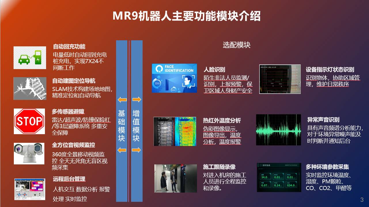 MR9 机房巡检机器人是专门为数据中心机房、配电机房、设备机房等各类室内环境机房进行无人值守自动运维工作而开发定制的专业巡检机器人。