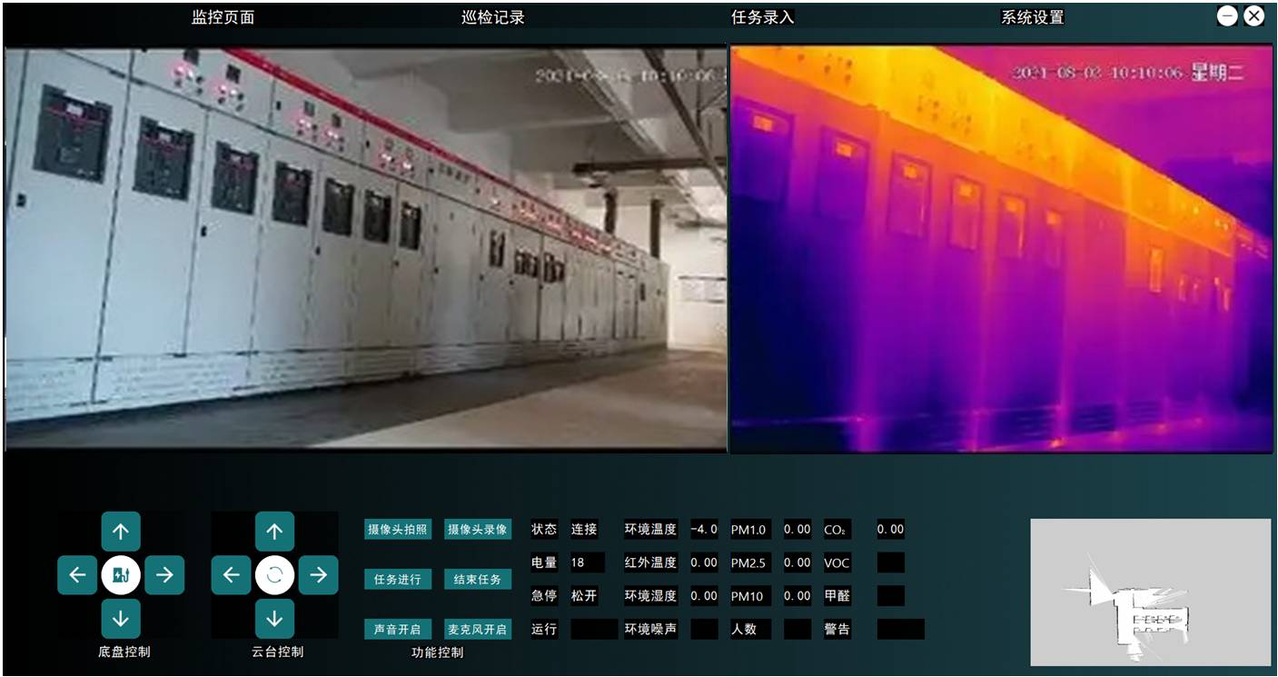 定路线,实现自主巡逻,利用SLAM雷达实现机体360度避障与防跌落功能。在电量不足时,巡检机器人可选取最短路径到达充电室进行自主充电。同时,配备可见光摄像机及红外热成像仪,可进行数据采集和智能分析诊断,并通过远程无线传输,替代人工实现远程例行巡检,实现对多个区域的现场环境全天候、全方位、全自主智能巡检和监控,提高正常巡检作业和管理的自动化、智能化水平和全方位的安全保障,既具有人工巡检的灵活性、智能性,也克服和弥补了人工巡检存在的一些缺陷和不足。