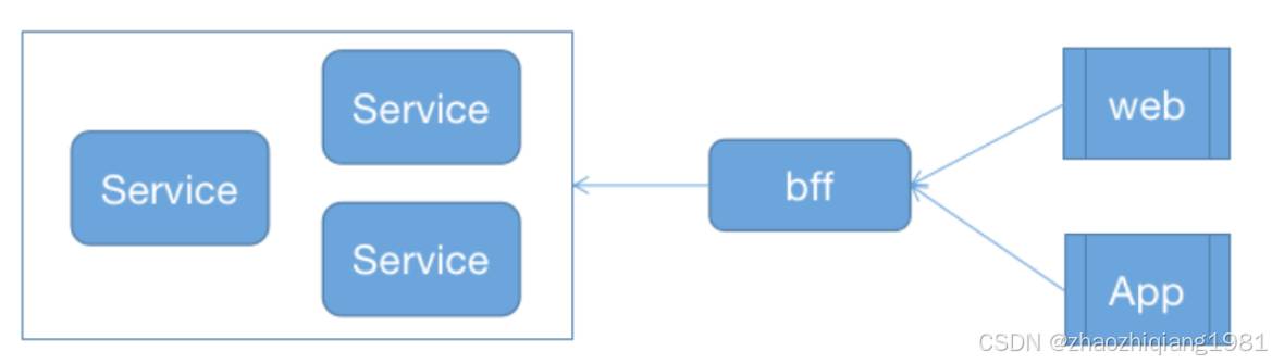 用中文解释就是服务于前端的后端。类似b站这种多类型客户端系统,前端可以是PC浏览器端,小程序端,Android/IOS客户端,可以通过创建一个bff架构,统一处理api,以及对应的鉴权等功能。