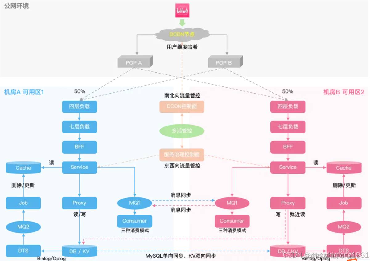 数据层:主要为 MySQL、KV 存储,主从同步模式;提供 Proxy 组件供业务接入,支持多可用区可读、就近读、写流量路由至主、强制读主等;