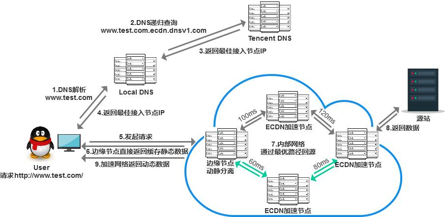 左侧方框里面是域名解析流程,CDN服务会根据你的IP定位,返回一个与你邻近的CDN节点IP。