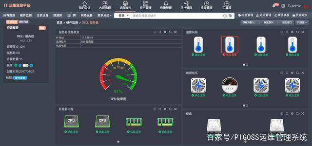 PIGOSS BSM监控系统以统一的视图展现服务器的整体信息和健康度。同时能够以清晰形象的图标呈现服务器各个硬件组件的运行状态,当服务器的某个组件出现问题时,系统能够以不同的颜色提醒出现问题的硬件部件,如下图: