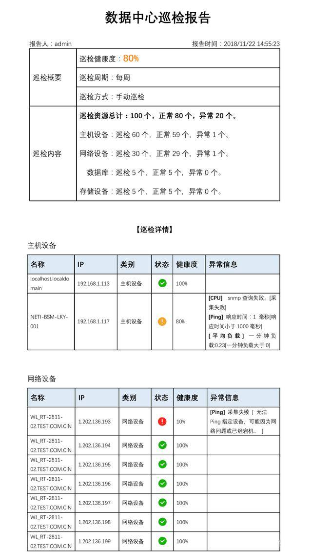 自动巡检,整个过程完全无人值守,可自动向指定邮箱发送巡检报告,也可在线查看巡检报告。