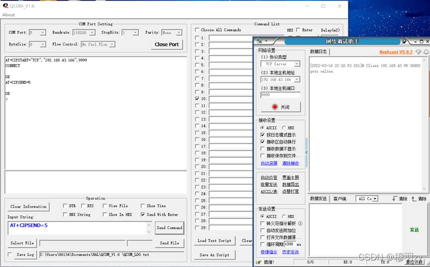 (4)回到串口调试助手,输入:AT+CIPSTART="TCP","192.168.43.166",9999